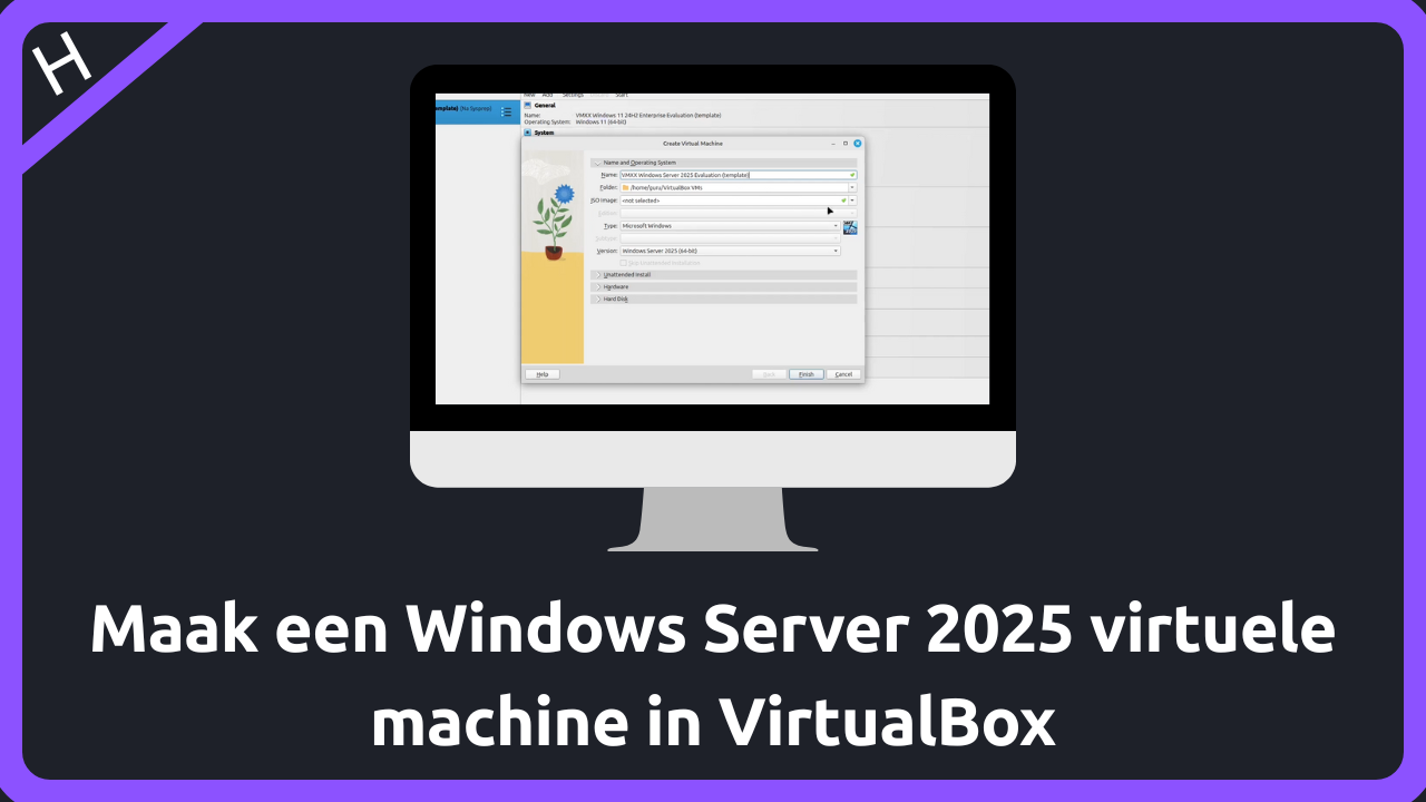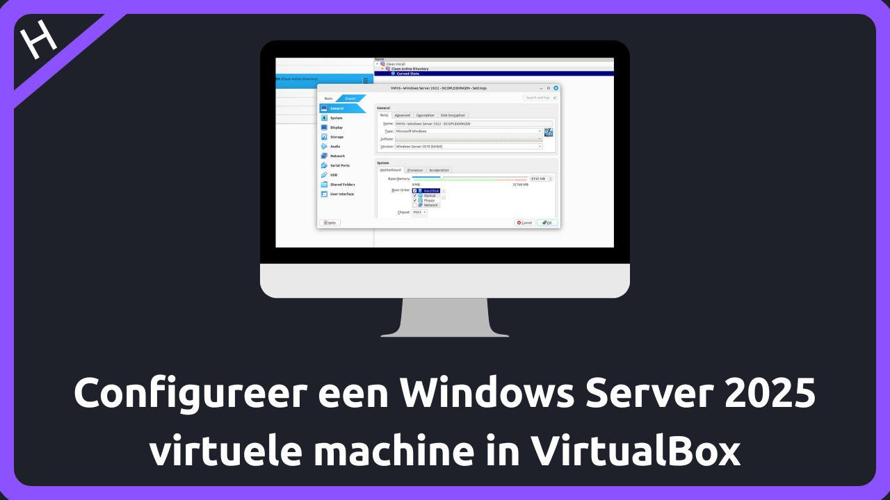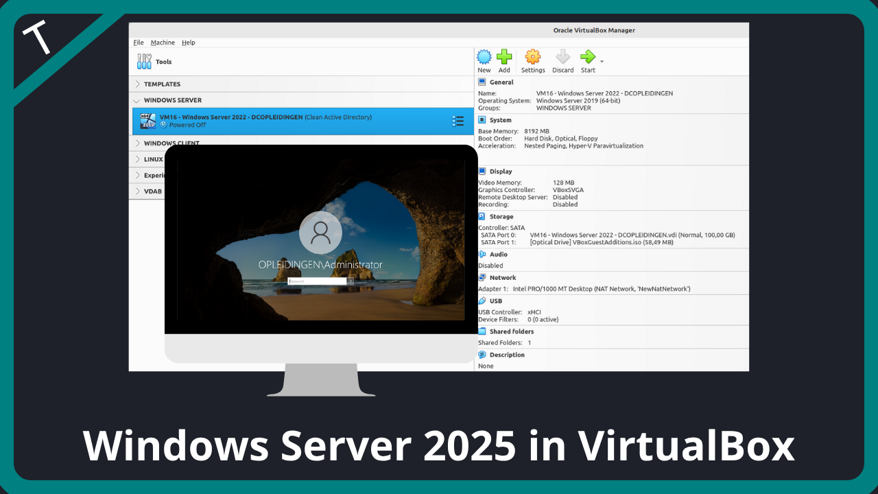 Het aanmaken van een lege virtuele machine (VM) voor Windows Server 2025 omvat het reserveren van virtuele hardware binnen de hypervisor VirtualBox.