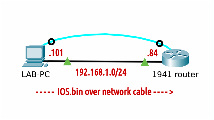 - Via een netwerkkabel: Hierbij gebruik je netwerkprotocollen zoals TFTP, SFTP (via SSH), of HTTP om de image over te dragen. Deze methode is enkel mogelijk vanuit een reeds werkend IOS en niet vanuit ROMmon, aangezien er netwerkfunctionaliteit vereist is.