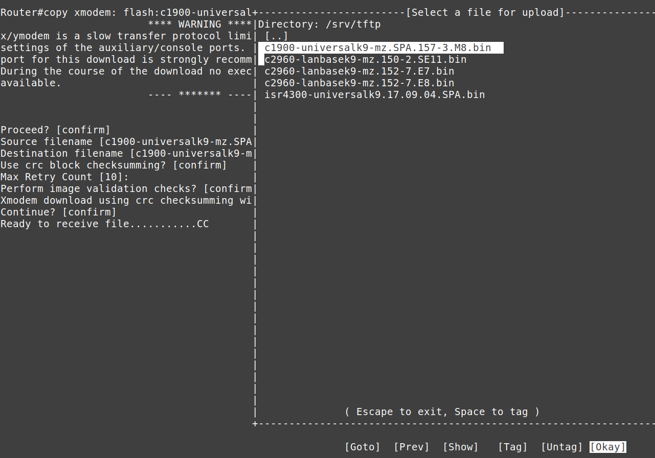 Voor minicom, druk op Ctrl+A en vervolgens op Z. Typ S (Send files) en selecteer "xmodem". Navigeer naar het nieuwe IOS-bestand (hier /srv/tftp). Druk op Space om het bestand te selecteren en druk "Oké" om te verzenden.