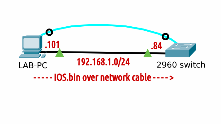 - Via een netwerkkabel: Hierbij gebruik je netwerkprotocollen zoals TFTP, SFTP (via SSH), of HTTP om de image over te dragen. Deze methode is enkel mogelijk vanuit een reeds werkend IOS en niet vanuit ROMmon, aangezien er netwerkfunctionaliteit vereist is.