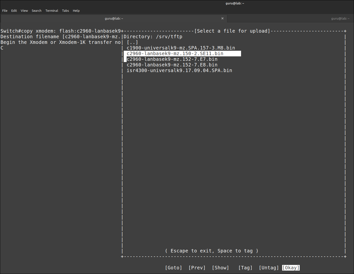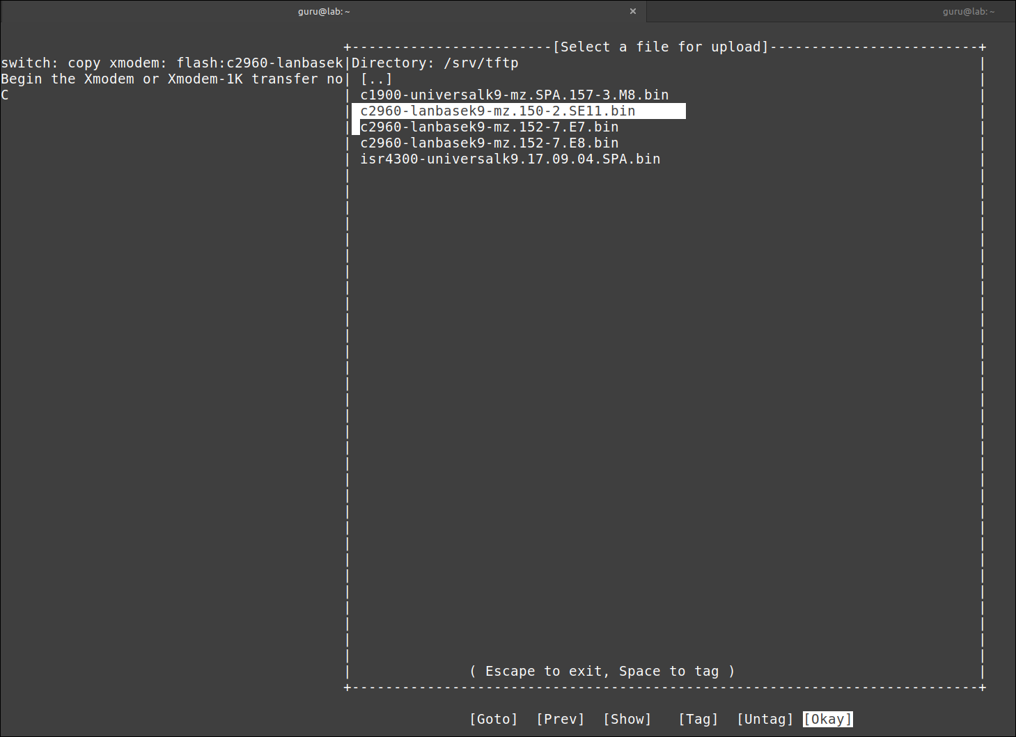Voor minicom, druk op Ctrl+A en vervolgens op Z. Typ S (Send files) en selecteer "xmodem". Navigeer de map waar het IOS bestand zich bevindt (hier /srv/tftp). Druk op Space om het bestand te taggen en Enter "Okay" om te verzenden.