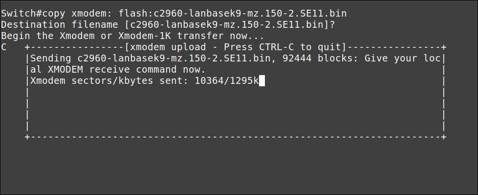 Start een xMODEM-overdracht. Bevestig de doelbestandsnaam. De switch vraagt je vervolgens om de overdracht te starten vanuit je terminalemulator.
