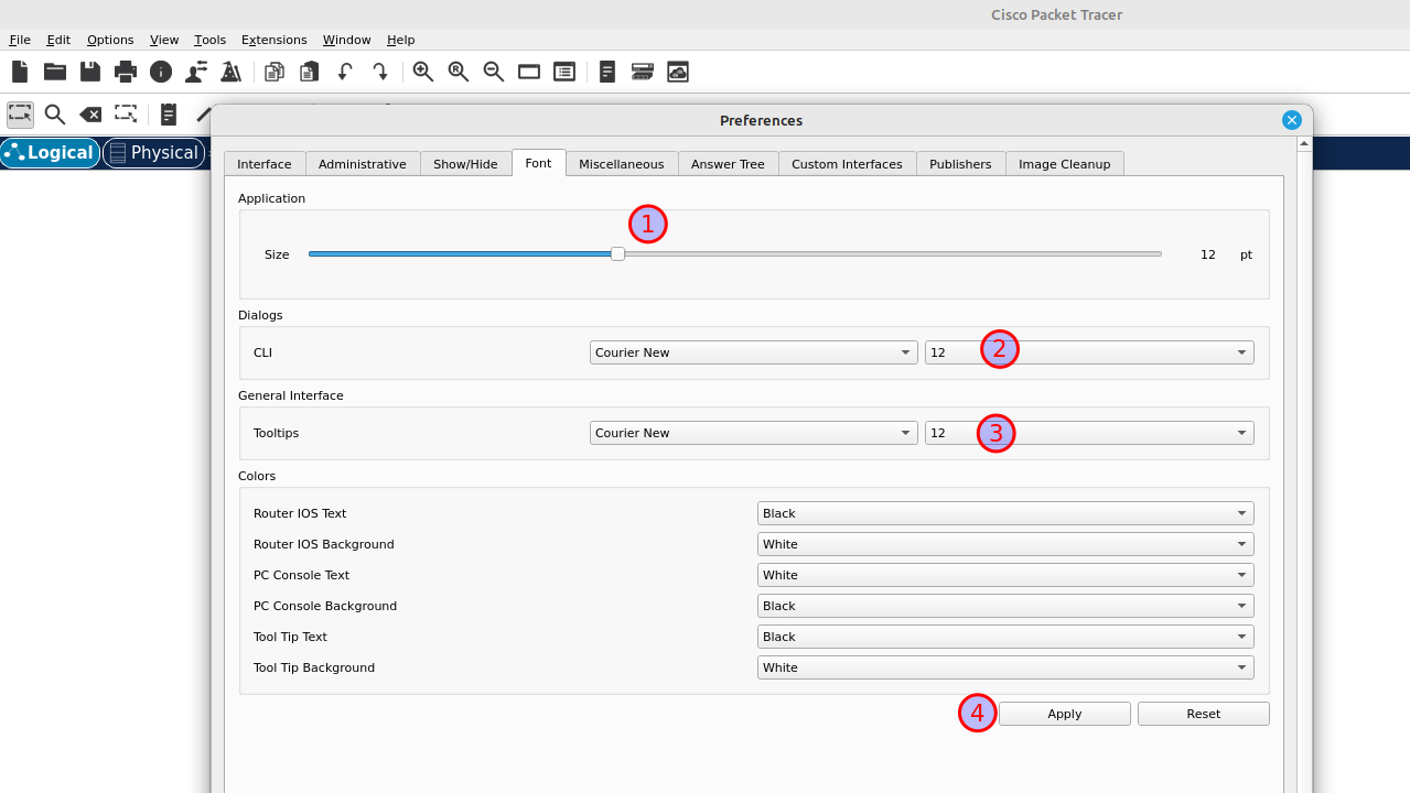 Persoonlijke voorkeur. Selecteer Options -> Preferences -> Font. Vergroot de lettergrootte naar 12 en klik op Apply.